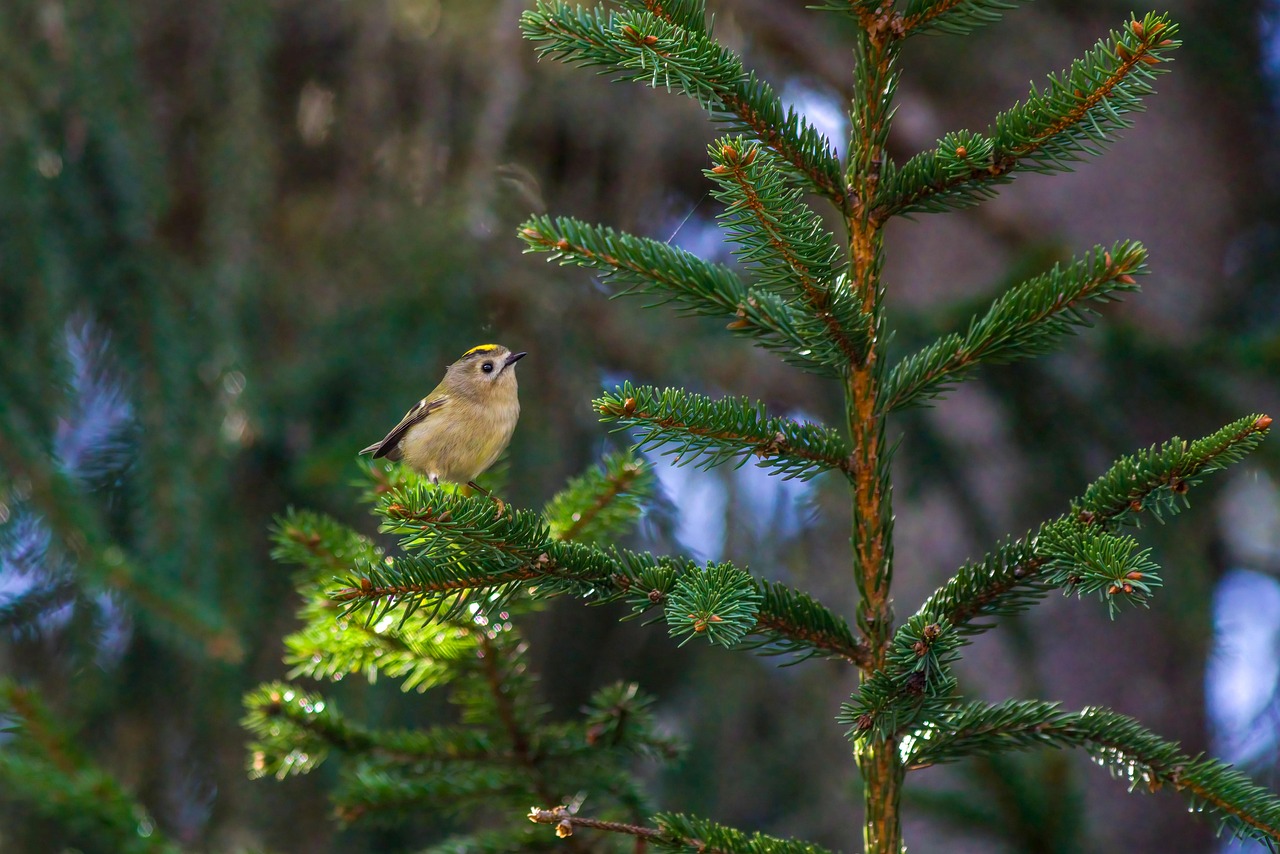 Goldcrests, the UK's smallest bird, are specialists of coniferous woodland, hovering at needle tips to glean tiny insects. Their rarer relative, the firecrest – a winter visitor to southern England with distinctive striped face markings and a bright orange centre on males – shares this dependence on conifers.